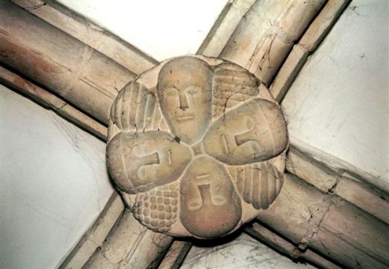 Nad dawnym wejściem bocznym znajduje się romański tympanon z końca XII w. przedstawiający płaskorzeźbiony krzyż wczesnochrześcijański, po bokach którego jest słońce, księżyc i ptak jako symbole śmierci Chrystusa. Nad romańskim portalem wejscia głównego umieszczony jest maswerk z XIII wieku.